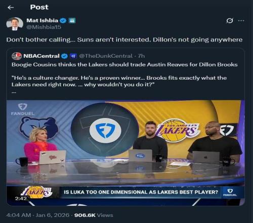 隨后,太陽隊老板馬特-伊什比亞轉(zhuǎn)發(fā)了考辛斯的這段發(fā)言,并否決了這一提議:“別費勁心思打電話了,太陽隊沒興趣做這筆交易。狄龍哪兒也不會去。”