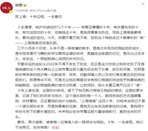 賀慣在文中說,我要懷著萬般不舍,告別這個陪我走過十載春秋的 “家”——上海海港足球俱樂部。過去的三千六百多個日夜,從來不是一串單薄的數字,是每次失敗后的爬起后的成長,是奪冠夜漫天飛舞的彩帶與震耳欲聾的歡呼,是融進血脈里的記憶,是無論過去多久、走多遠,一想起就滿心滾燙的歲月印記。